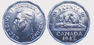 Depending on its condition, its scarcity, supply and demand and errors and varieties, the value of a 5 cents 1947 varies. Below, the details of the value of the coin according to its grade. To help you to know the meaning of grades such as G4, VG8, F12, VF20, EF40, AU50, MS60, etc.,