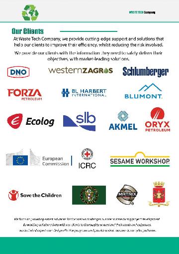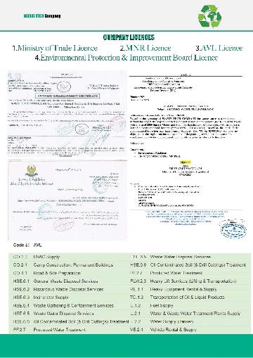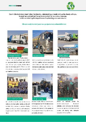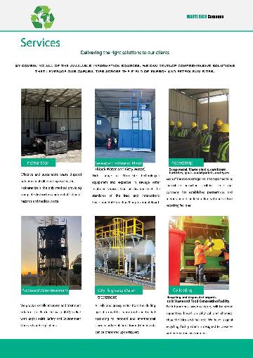 Oil Skimming, Solution to Radiated sand and water, Recycling Scrap metal, Waste plastic, cardboard, batteries, glass, wood pallets, & Tyres, Sewage (Black Water and Gray Water) Treatment, Produced Water treatment, Oily and greasy Water treatment, Repair and maintenance for Cars and Vehicles, Camp cleaning services, Heavy Equipment and vehicle rental and supplies, Construction services, General transportation services, Oil Transportation, Rig Move Services, Collecting, Recycling, Removal and disposal of organic and solid Waste, Garbage Trucks, Vacuum trucks and Incinerator