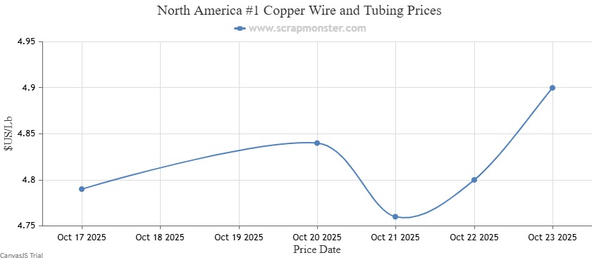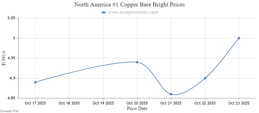 Los precios del #1 Copper Bare Bright en el Scrap Monster Price Index aumentaron 0 $.11 por libra a partir del jueves, 23 de octubre de 2025, un aumento semanal de '2,23%. #El alambre y tubería de cobre nº 1 subió 0,11 dólares por libra, experimentando un aumento de '2,27% respecto a la semana anterior. Los precios de los alambres y tubos de cobre habían aumentado un 2,32% al final de la semana.