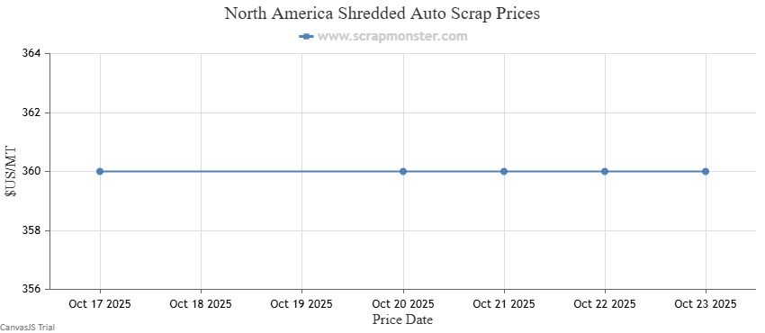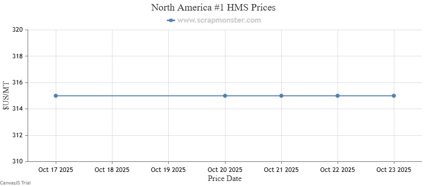 El precio del #1 HMS en el Scrap Monster Price Index se mantuvo estable el jueves 23 de octubre de 2025. La chatarra de automóvil triturada no experimentó variación de precios respecto a la semana anterior. Al final de la semana, el precio del HMS 80/20 no había registrado ninguna fluctuación. #Los precios del Busheling nº 1 también se mantuvieron estables respecto a la semana anterior.