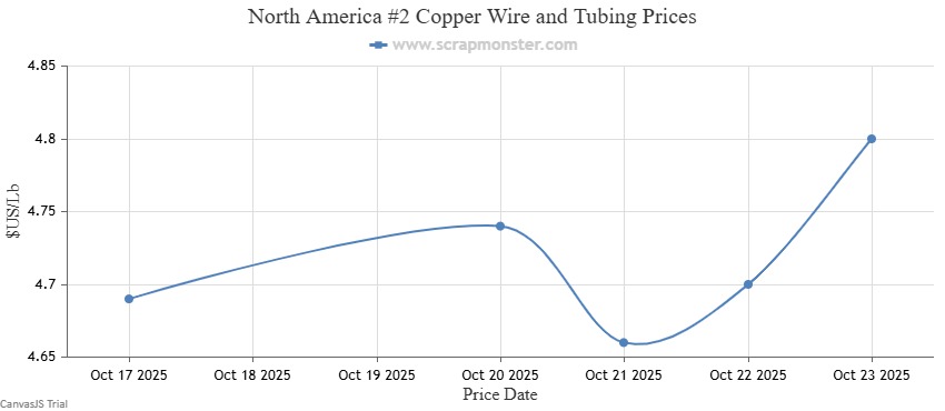 El precio del Cobre Desnudo Brillante nº 1 en el Scrap Monster Price Index subió 0,11 dólares.11 por libra a partir del jueves, 23 de octubre de 2025, un aumento semanal de '2,35%. El #1 Copper Wire & Tubing subió 0,11 dólares por libra, registrando un salto de '2,40% respecto a la semana anterior. Al final de la semana, el precio del alambre y tubo de cobre nº 2 había aumentado un '2,45% para cerrar la semana a 4,60 dólares la libra.