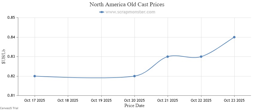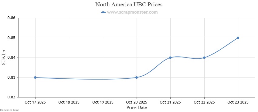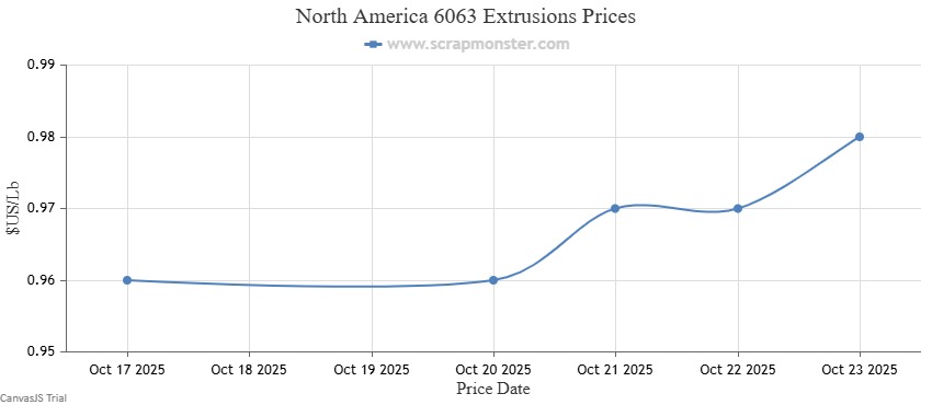 El precio del alambre de aluminio E.C. Aluminum Wire en el Scrap Monster Price Index subió 0,04 $ por libra el jueves 23 de octubre de 2025, un aumento semanal de '3,23%. Los extruidos 6063 subieron 0,02 dólares por libra, registrando un aumento del 2,08% respecto a la semana anterior. Al final de la semana, el precio del Old Cast había aumentado un '2,44% hasta 0,02 $ más por libra. Asimismo, los precios del UBC registraron un aumento semanal del '2,41%