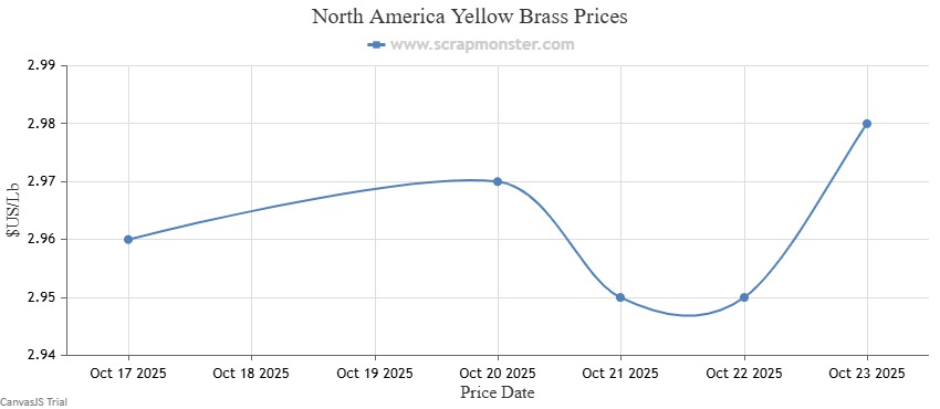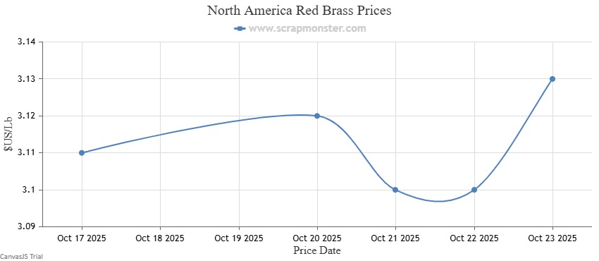 El precio del Latón Rojo en el Índice de Precios de la Chatarra aumentó en 0,02 $ por libra el jueves, día en el que se publicaron los precios de la chatarra.02 por libra a partir del jueves, 23 de octubre de 2025, un aumento semanal de '0,64%. El latón amarillo subió 0,02 dólares por libra, registrando un incremento de '0,68% respecto a la semana anterior.
