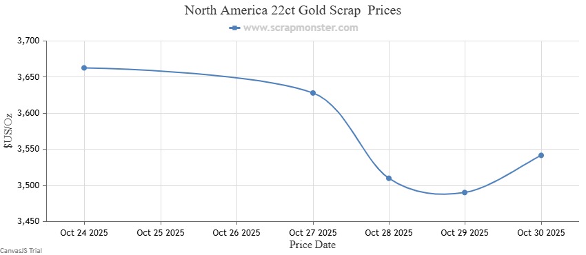 Los precios de la chatarra de oro de 18 y 22 quilates también registraron notables descensos, de 99,19 $ por Oz y 121,14 $ por Lb respectivamente.