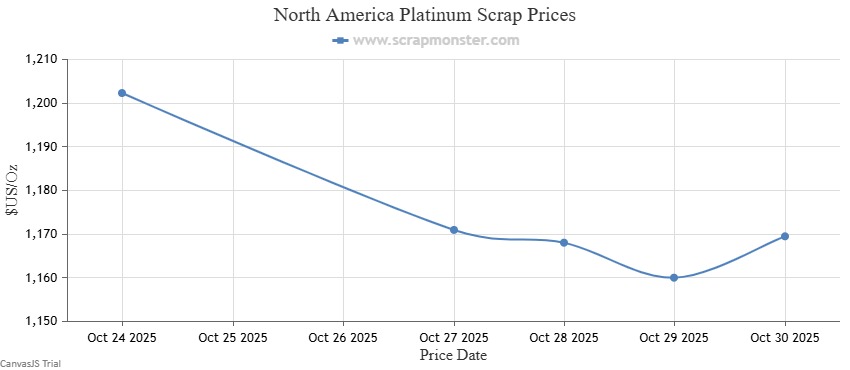 El precio de la chatarra de platino cerró la semana en 1.169,51 $, registrando un descenso del 2,73% desde el precio de apertura de 1.202,32 $ por Oz. La evolución semanal de los precios de la chatarra de platino sin marcar se muestra en el siguiente gráfico: