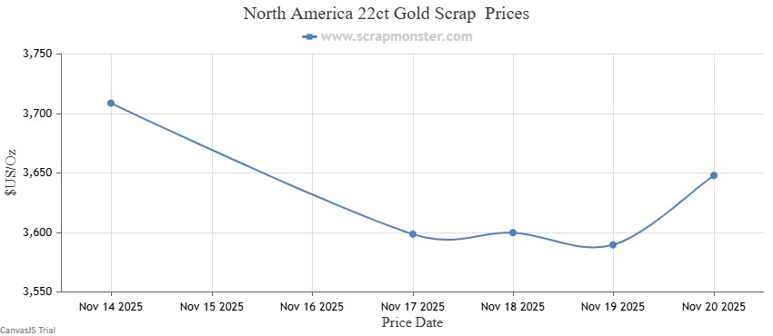 SEATTLE (Scrap Monster): El mercado norteamericano de chatarra de metales preciosos fue testigo de un amplio descenso durante la semana del 14 al 20 de noviembre de 2025, según el Índice de Precios ScrapMonster. Los precios de la chatarra de oro, plata y platino, con y sin marca, tendieron a la baja en la mayoría de las categorías.