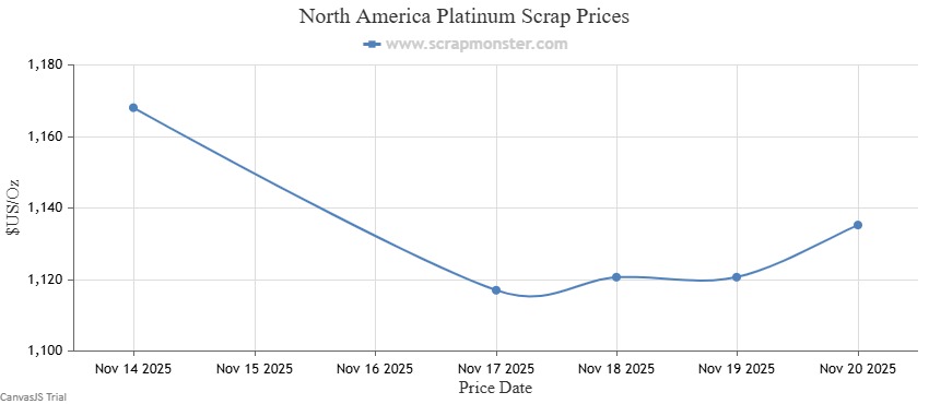 Los precios de la chatarra de metales preciosos no calificada en Norteamérica registraron descensos en todas las categorías principales durante la semana del 14 al 20 de noviembre, 2025, según el Índice de Precios ScrapMonster.