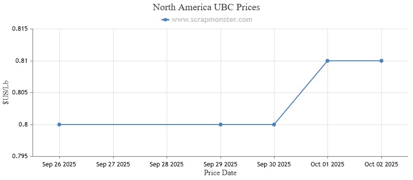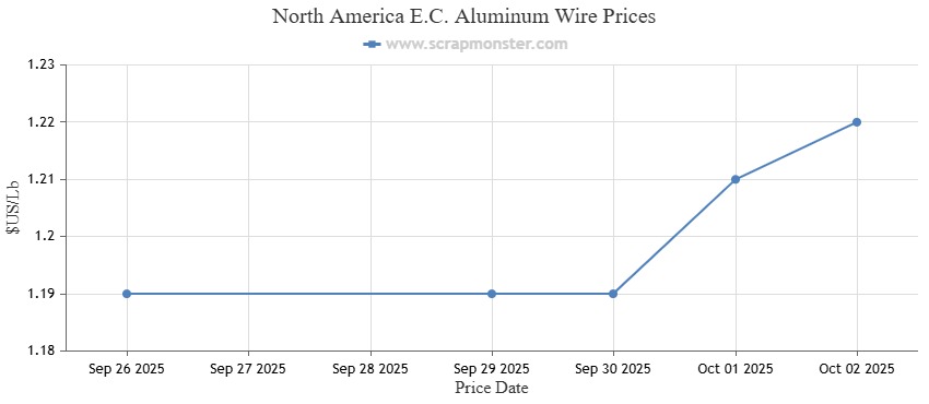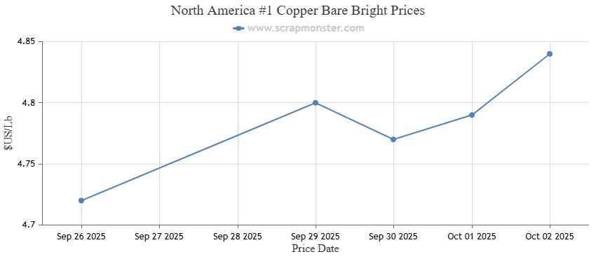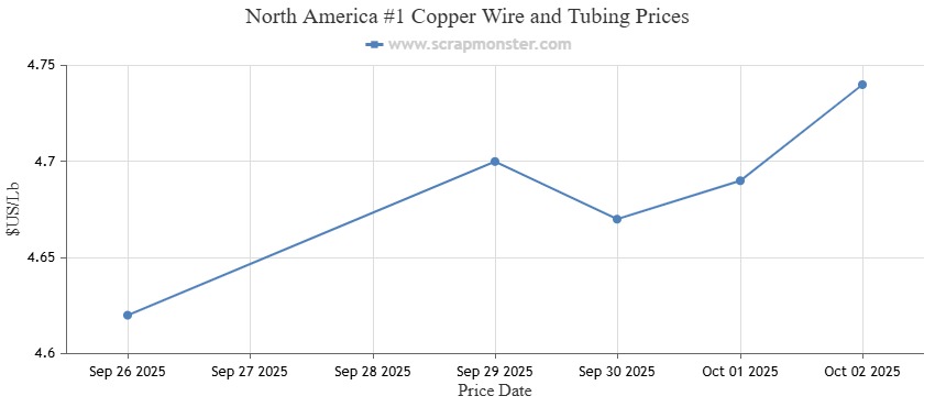 A fecha de jueves, 2 de octubre de 2025, el precio del cobre n.º 3 (cobre ligero) en el índice ScrapMonster subió un 2,72 % durante la semana, pasando de 4,31 a 4,43 dólares por libra. El cobre n.º 2 (alambre y tubos) subió ligeramente desde el precio de cierre de la semana anterior, pasando de 4,41 a 4,53 dólares por libra. El precio medio del alambre y tubos de cobre n.º 1 había aumentado un 2,66 % hasta alcanzar los 4,63 dólares por libra al final de la semana.