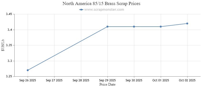 Los precios de la chatarra de latón 85/15 fueron los que más subieron. Los precios de la materia prima subieron un 4,55 % y cerraron la semana en 3,45 dólares por libra el jueves 2 de octubre de 2025. Además, los precios de las barras perforadas, el latón amarillo, los radiadores de latón, la chatarra de latón 70/30, la chatarra de latón 80/20 y el latón rojo registraron un aumento con respecto a la semana anterior.