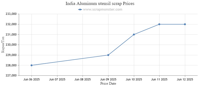 The Aluminum utensil scrap prices witnessed a jump of 1.75% from the prior week’s prices. The commodity’s prices closed at INR 232,000 per Ton as of Thursday, June 12, 2025. The weekly price chart of Aluminum utensil scrap is provided below: