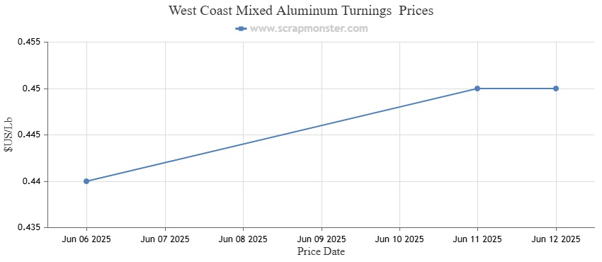 Prices for Mixed Aluminum Turnings increased by 2.27% from the previous week. The commodity's price increased from $0.44 per Lb to $0.45 per Lb over the previous week. The weekly price movement for Mixed Aluminum Turnings is seen in the chart below: