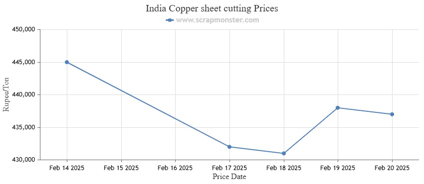 The copper sheet cutting scrap prices recorded the biggest fall, edging lower by 1.80% to close at INR 437,000 per Ton as of February 20, 2025. The weekly chart of the commodity is provided below: