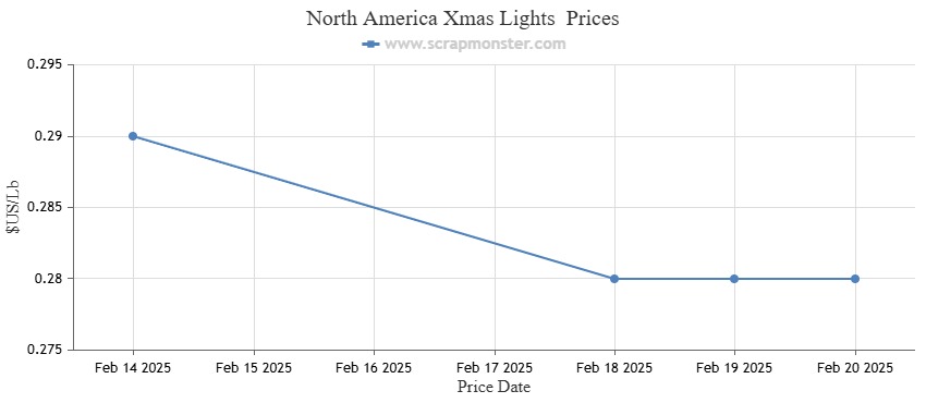 The Xmas Lights prices ended the week at $0.27 per Lb, down from the previous week’s price of $0.28 per Lb. Also, Sealed Units and Starters decreased over the previous week to close at $0.38 per Lb and $0.39 per Lb respectively.