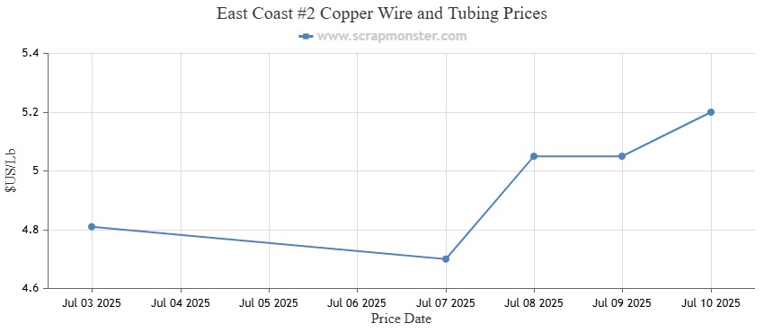 #2 Copper Wire and Tubing prices were up by 8.11% over the week, rising from $4.81 per Lb to $5.20 per Lb.