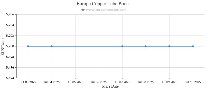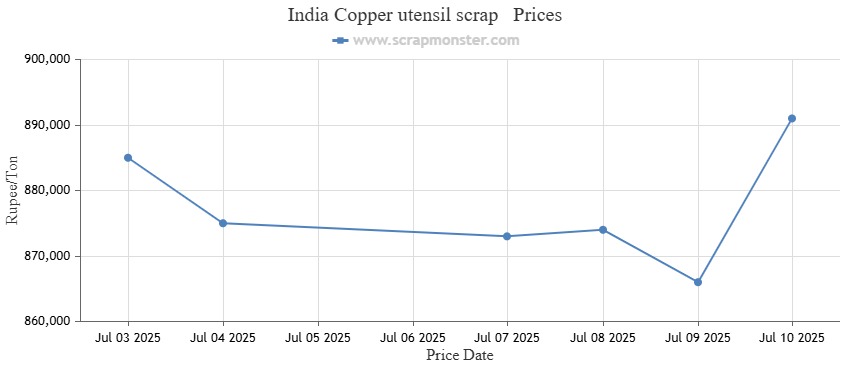 The copper sheet cutting scrap prices were down by INR 14,000 per ton over the previous week to close at INR 452,000 per ton on July 10, 2025 on the Scrap Monster Index.