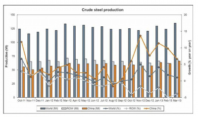 The World Steel Association reported earlier this week that, for the month of March, world steel output increased 1% year-on-year to 135 million mt, while world crude steel production in 10 2013 was up 2.3% y-o-y to reach 388.7 million mt. Out of the Jan-Mar total, the association reports Asia accounted for nearly 260 million mt of crude steel output (+6.4%), while production in the EU declined 5.4% to 41.5 million mt and North American output dropped 5.7% to 29.7 million mt as compared to 10 2012: