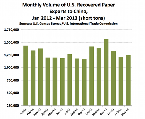 According to figures from the US census Bureau, US exports of recovered paper to China in March increased to 1.25 million short tons valued at $170 million.But as compared to Jan-Mar 2012, first quarter 2013 RP exports to China fell 9% by volume to 3.8 million short tons and 15% by value to $512 million.Here’s the trend in monthly US recovered paper and fiber shipments to China since January 2012.