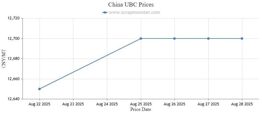 The least increase in prices was seen in UBC, whose prices were up by 0.4% during the week ended August 28, 2025. The prices ended the week at CNY 12,700 per MT, when compared with CNY 12,650 per MT at the beginning of the week. The below chart depicts the weekly price variation in the prices of the commodity: