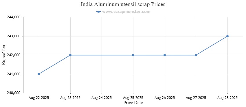 The Aluminum utensil scrap prices were up marginally by 0.83% during the week. The prices edged higher from INR 241,000 per Ton to INR 243,000 per Ton on the ScrapMonster Index. The weekly price chart of Aluminum utensil scrap is provided below: