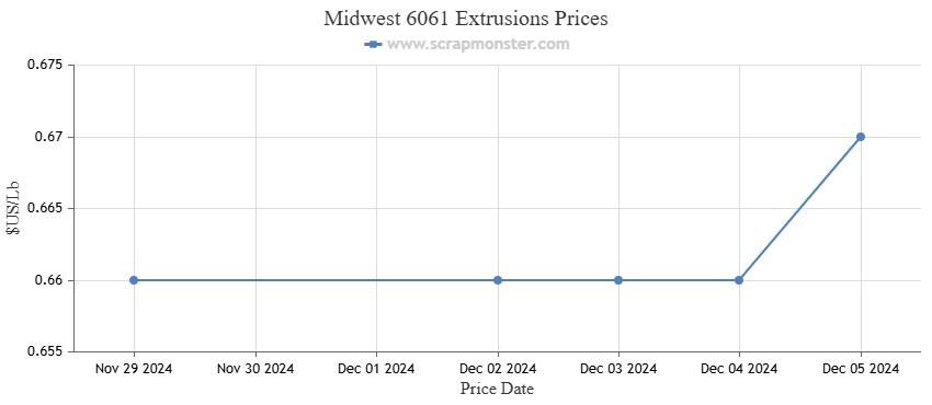 The prices of 6061 Extrusions increased by 1.52% on a weekly basis, from $0.66 per pound to $0.67 per pound in the week that ended on December 5, 2024. Below is the weekly price chart for the commodity: