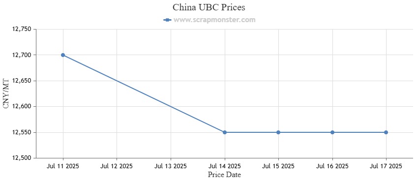 The least dip in prices was seen in UBC, whose prices were down by 1.18% during the week ended July 17, 2025. The prices ended the week at CNY 12,550 per MT, when compared with CNY 12,700 per MT at the beginning of the week. The below chart depicts the weekly price variation in the prices of the commodity: