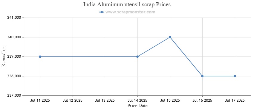 The Aluminum utensil scrap prices were down marginally by 0.42% during the week. The prices edged lower from INR 239,000 per Ton to INR 238,000 per Ton on the ScrapMonster Index. The weekly price chart of Aluminum utensil scrap is provided below: