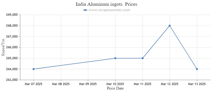 The Aluminum ingots prices witnessed no variation from the prior week’s prices. The commodity’s prices held steady at INR 264,000 per Ton during the week. The weekly price chart of Aluminum ingots is provided below: