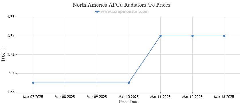 Prices for Al/Cu Radiators/Fe increased by 2.96% from the previous week. From $1.69 per pound at the beginning of the week, prices increased by $0.05 per pound to close at $1.74 per pound on the Index.