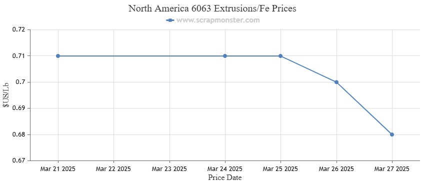 The 6063 Extrusions/Fe prices ended the week at $0.67 per Lb, down from the previous week’s price of $0.70 per Lb, registering a weekly decline of 4.29%.