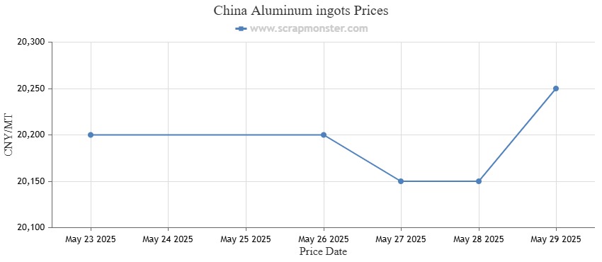 The least increase in prices was seen in Aluminum Ingots, whose prices were up by 0.25% during the week ended May 29, 2025. The prices ended the week at CNY 20,250 per MT, when compared with CNY 20,200 per MT at the beginning of the week. The below chart depicts the weekly price variation in the prices of the commodity: