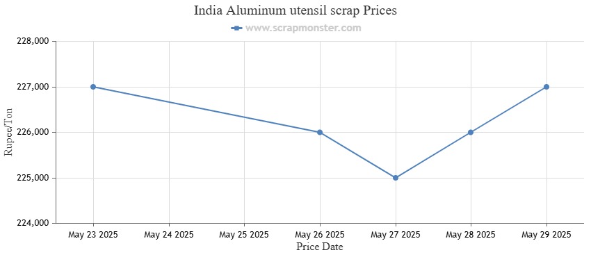 The Aluminum utensil scrap prices were unchanged during the week. The prices were flat at INR 227,000 per Ton on the ScrapMonster Index. The weekly price chart of Aluminum utensil scrap is provided below: