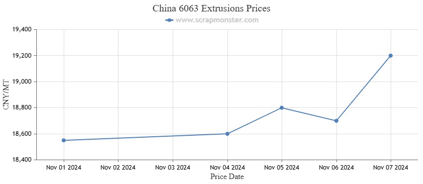 The prices of 6063 Extrusions increased by 3.5% week-on-week. The prices of the commodity increased from CNY 18,850 per MT to CNY 19,200 per MT during the week. The weekly price variation in 6063 Extrusions is seen in the chart below: