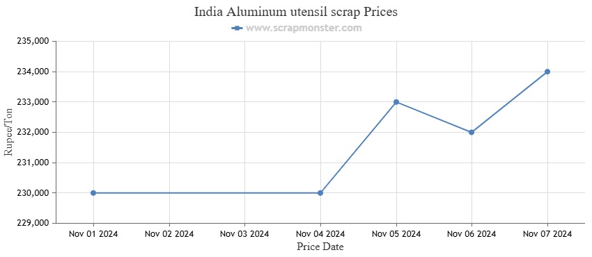 The prices of scrap aluminum utensils saw a little increase of 1.74%, edging higher to INR 234,000 a tonne during the week ending on November 7, 2024.