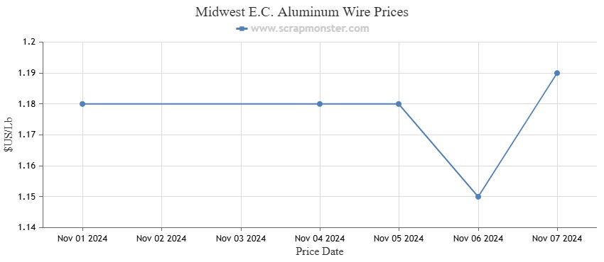E.C. Aluminum Wire and 5052 Scrap prices increased in comparison with the previous week. E.C. Aluminum Wire prices recorded a minor increase of $0.01 per Lb, from $1.18 per Lb to $1.19 per Lb. The following chart shows the week-over-week price fluctuation for E.C. Aluminum Wire: