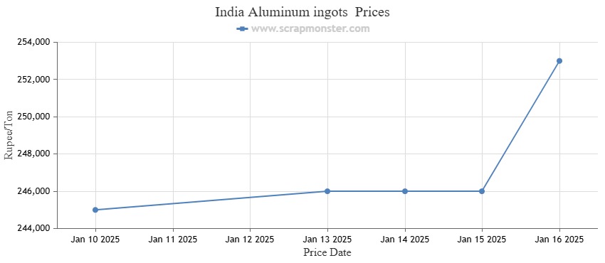 The Aluminum utensil scrap prices also were up by 3.39% week-on-week, closing at INR 244,000 per Ton on the ScrapMonster Index.