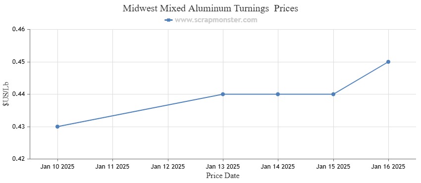 The prices of Mixed Aluminum Turnings increased by 4.65% on a weekly basis, from $0.43 per pound to $0.45 per pound in the week that ended on January 16, 2025. Below is the weekly price chart for the commodity: