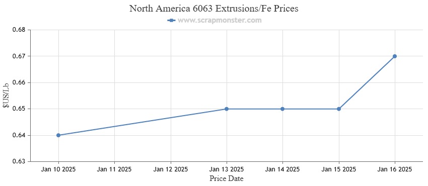 Prices for 6063 Extrusions/Fe increased by 4.69% from the previous week. From $0.64 per pound at the beginning of the week, prices increased by $0.03 per pound to close at $0.67 per pound on the Index.