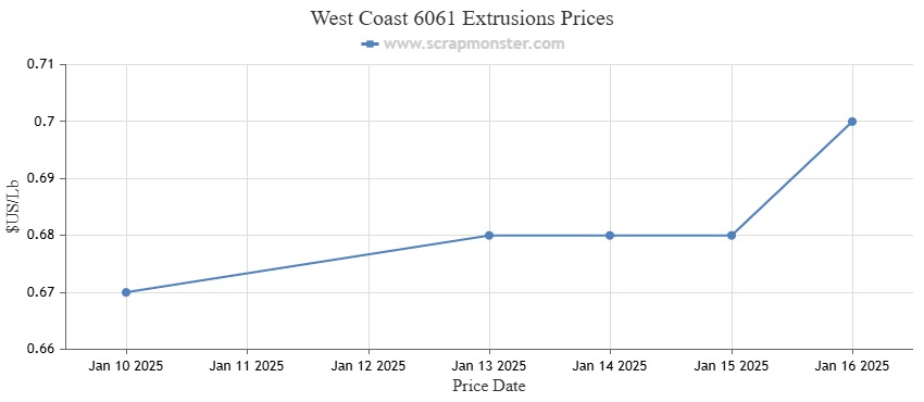 Prices for 6061 Extrusions increased by 4.48% from the previous week. The commodity's price increased from $0.67 per Lb to $0.70 per Lb over the previous week. The weekly price movement for 6061 Extrusions is seen in the chart below: