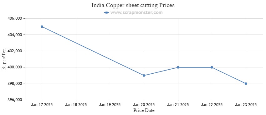 The Copper sheet cutting prices recorded the biggest decline, with the prices of the commodity recording decline by 1.73%. The prices of the commodity fell from INR 405,000 per Ton to INR 398,000 per Ton. The weekly chart depicting the price movement in Copper sheet cutting is provided below:
