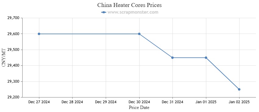 Heater Cores and #2 Copper Wire and Tubing recorded the largest decline during the previous week. The prices of Heater Cores and #2 Copper Wire and Tubing registered 1.18% and 1.17% decline respectively week-on-week, to close at CNY 29,250 per MT and CNY 67,600 per MT respectively on the Index.