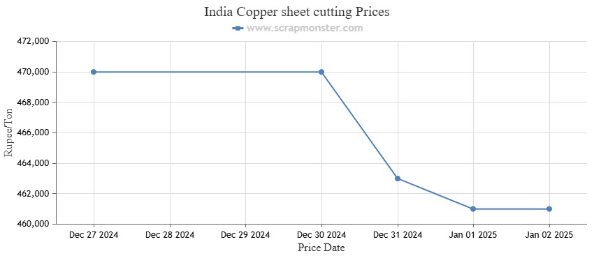 The copper sheet cutting scrap prices recorded the biggest fall, edging lower by 1.91% to close at INR 4610,000 per Ton as of January 2, 2025. The weekly chart of the commodity is provided below: