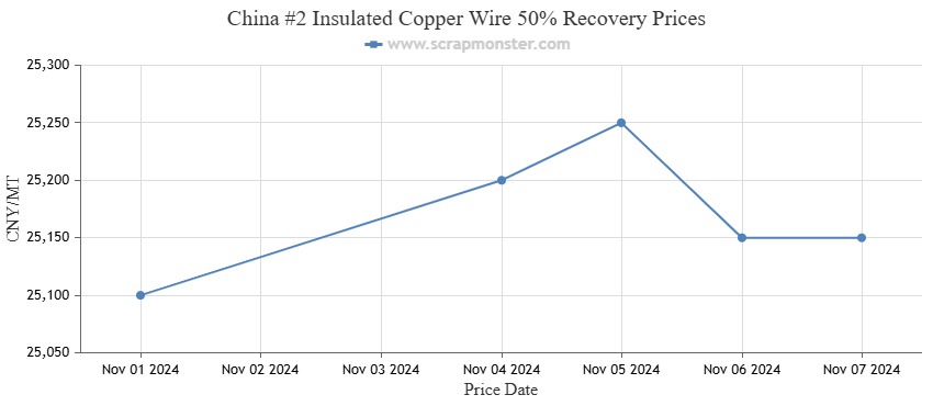 #2 Insulated Copper Wire 50% Recovery prices recorded marginal increase from CNY 25,100 per MT to CNY 25,150 per MT during the previous week. The weekly price char of the commodity is provided below: