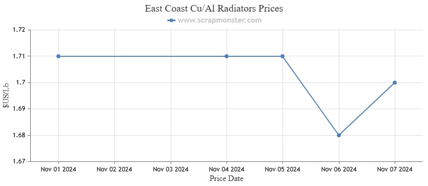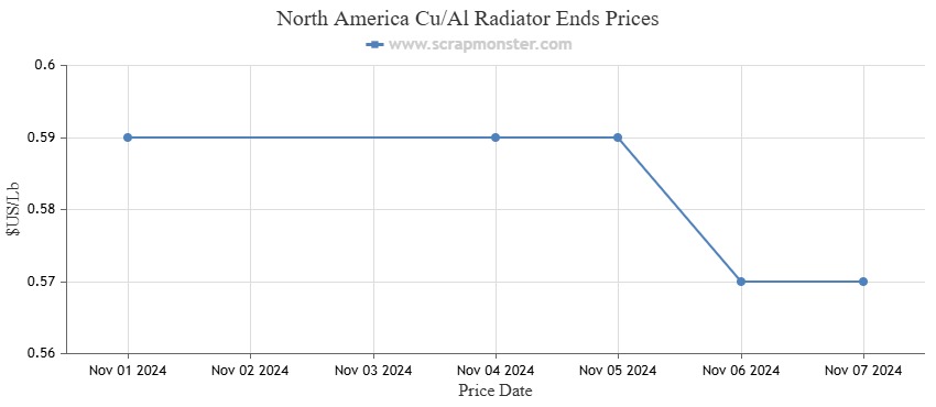 Cu/Al Radiator Ends saw the largest price decrease over the previous week, going down from $0.59 per pound to $0.57 per pound.