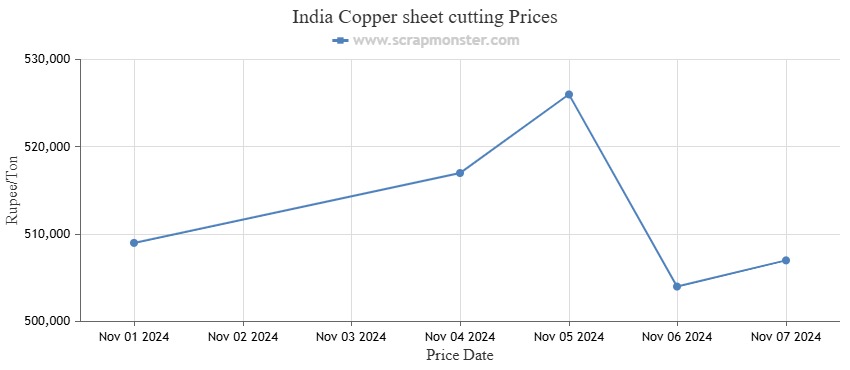 The copper sheet cutting prices dropped by INR 2,000 per Ton to INR 507,000 per Ton over the prior week. The weekly chart of the commodity is provided below: