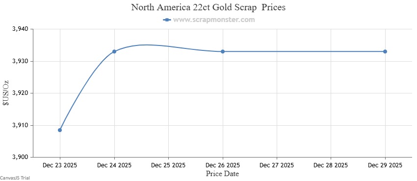 14-carat gold scrap prices advanced by $15.66 per ounce, indicating a mild improvement in buying interest. 18-carat gold scrap saw a stronger rise, climbing $20.09 per ounce over the week. Meanwhile, 22-carat gold scrap registered the most notable increase among gold categories, surging by $24.53 per pound, as illustrated in the weekly price trend chart.
