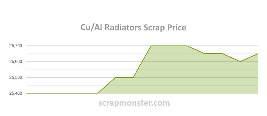 The prices of Cu/Al Radiators, Alternator, Copper Transformer Scrap, Cu/Al Radiator Ends and Cu/Al Radiators/Fe held steady on Scrap Monster Index.