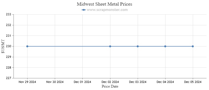 The Sheet Metal prices witnessed no change from previous week’s level of $230 per MT.
