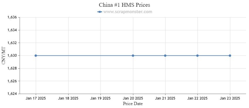 The Chinese steel scrap market remained flat during the week. The Cast Iron Scrap prices witnessed no change from the prior week. Also, #1 HMS prices held steady at CNY 1,630 per MT, as displayed in the below chart.
