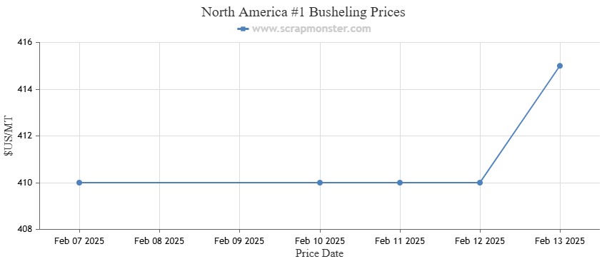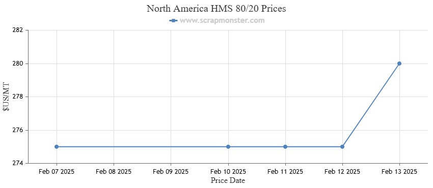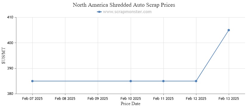 #1 HMS's prices recorded week-on-week jump by 6.06%. Shredded Auto Scrap was likewise up by 5.19%, rising from $385 per MT to $405 per MT during the week. At $280 per MT, the Index's HMS 80/20 pricing increased by 1.82%. The price of #1 Busheling also edged higher by 1.22% during the week ending February 13, 2025.