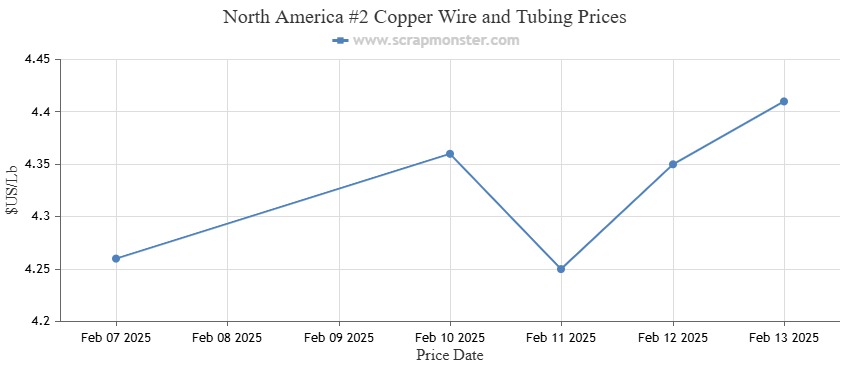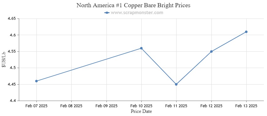 The price of #1 Copper Bare Bright on the ScrapMonster Index increased by 3.36% for the week, from $4.46 to $4.61 per pound, as of Thursday, February 13, 2025. Over the past week, the price of #1 Copper Wire and Tubing increased from $4.36 to $4.51 per pound. By the end of the week, #2 Copper Wire and Tubing was selling for $4.41 per pound, a slight rise of 4.26%.